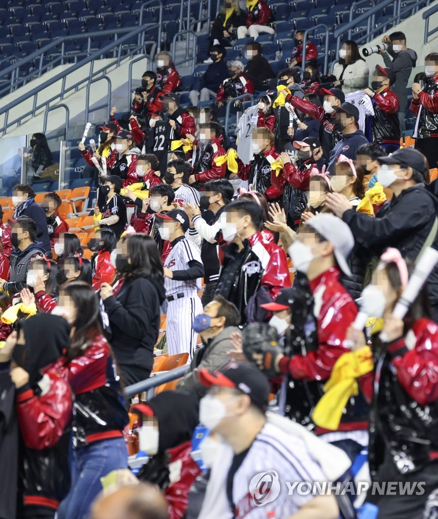 | ▲  Fans of the LG Twins cheer on their Korea Baseball Organization (KBO) club during a KBO regular season game against the Kiwoom Heroes at Jamsil Baseball Stadium in Seoul on Oct. 19, 2021. (Yonhap) |