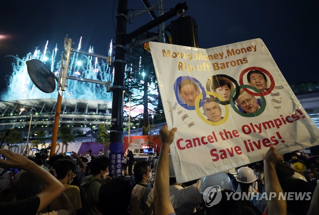 | ▲ A protester to the Tokyo Olympics holds up a sign outside the National Stadium in Tokyo during the opening ceremony of the global sporting event on July 23, 2021. (Yonhap) |