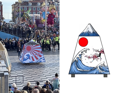 올해로 150주년을 맞은 니스 카니발은 지난 2월 10일 프랑스 남부 휴양도시 니스에서 '세계 최고의 보물'을 주제로 개막했는데, 그다음 날인 11일 퍼레이드에 욱일기를 떠오르게 하는 조형물이 나왔다.