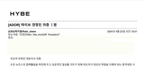 하이브는 박지원 최고경영자(CEO) 명의로 민 대표에게 보낸 메일 기록도 공개하며 "아티스트를 볼모로 회사를 협박하고 있는 쪽은 민 대표"라고 강한 어조로 비판했다.