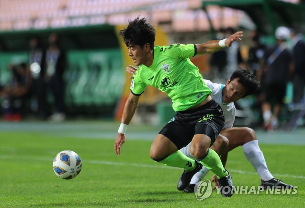 | ▲ Lee Ju-yong of Jeonbuk Hyundai Motors (L) tries to get to the ball against BG Pathum United during the clubs' round of 16 match at the Asian Football Confederation Champions League at Jeonju World Cup Stadium in Jeonju, 240 kilometers south of Seoul, on Sept. 15, 2021. (Yonhap) |