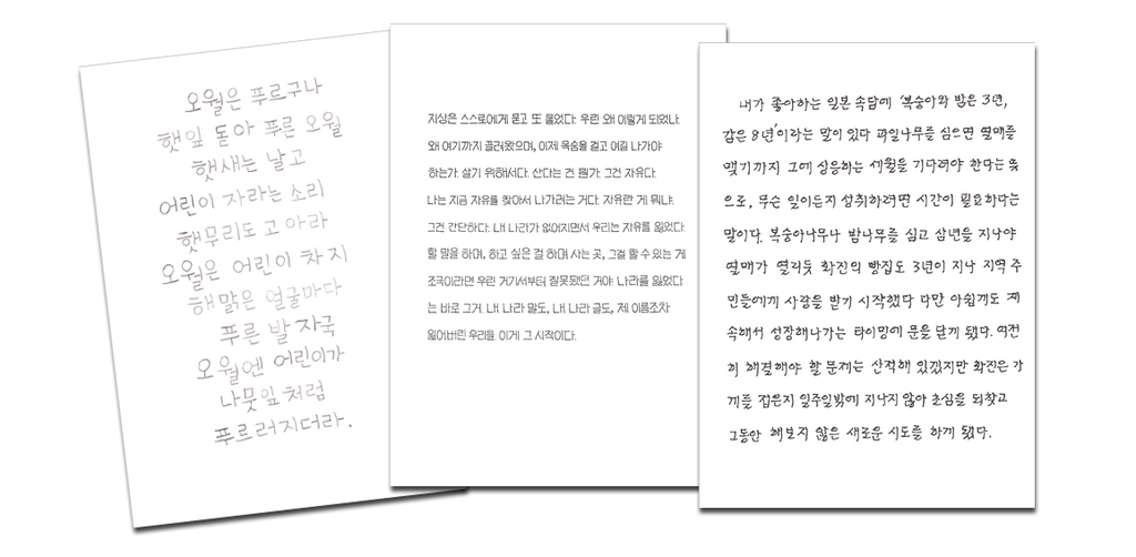 | ▲ 왼쪽부터 박예원, 김주하, 김혜남 씨 손글씨 [교보문고 제공. 재판매 및 DB금지] |