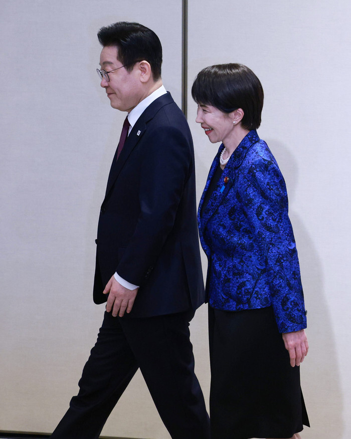 South Korean President Lee Jae Myung (L) and Japanese Prime Minister Sanae Takaichi walk together after holding a joint press conference following their talks in the ancient capital of Nara, western Japan, on Jan. 13, 2026. (Yonhap)