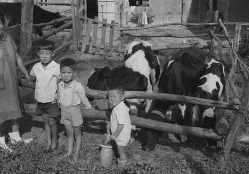 | ▲ This undated photo, provided by Heifer International Korea on Dec. 22, 2022, shows Korean children standing at a farm along with milk cows donated by the international community in the 1960s. (PHOTO NOT FOR SALE) (Yonhap) |
