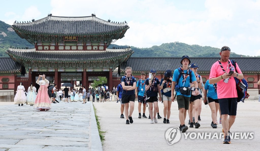 | ▲ 수문장 교대의식 관람 마친 영국 스카우트 대원들 (서울=연합뉴스) 김인철 기자 = 2023 새만금 세계 스카우트 잼버리에서 조기 퇴영한 영국 스카우트 대원들이 7일 오후 서울 종로구 경복궁에서 수문장 교대의식을 관람한 뒤 이동하고 있다. 2023.8.7 yatoya@yna.co.kr |