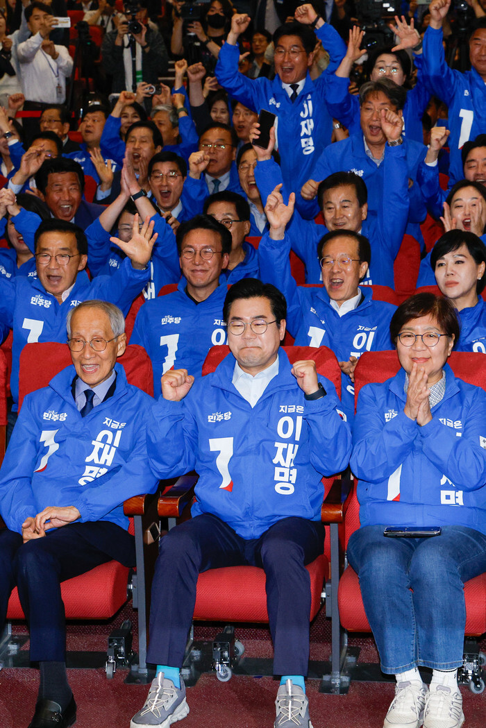 Officials of the liberal Democratic Party are joyous at the National Assembly in Seoul on June 3, 2025, after the result of exit polls showed the party's presidential candidate, Lee Jae-myung, leading Kim Moon-soo, the presidential candidate of the conservative People Power Party, in the presidential election that began the same day. (Pool photo) (Yonhap)
