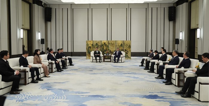 South Korean National Assembly Speaker Woo Won-shik (L, rear) holds talks with Chinese President Xi Jinping (R, rear) during their meeting at Taiyangdao Hotel in Harbin, northeastern China, on Feb. 7, 2025, in this photo provided by the speaker's office. (PHOTO NOT FOR SALE) (Yonhap)