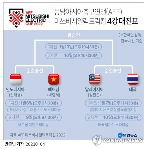 | ▲ [그래픽] AFF 미쓰비시일렉트릭컵 4강 대진표 (서울=연합뉴스) 반종빈 기자 bjbin@yna.co.kr 페이스북 tuney.kr/LeYN1 트위터 @yonhap_graphics |