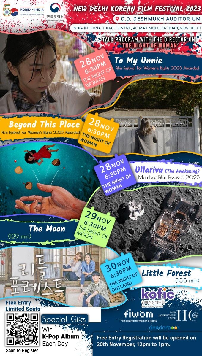 29일에는 인도가 최근 우주탐사 분야에서 이룬 성취를 축하하는 의미에서 한국 영화 '더 문'을 상영하고, 30일에는 인도에서 한식에 대한 관심이 커지는 점을 반영해 한국 영화 '리틀 포레스트'를 선보인다.