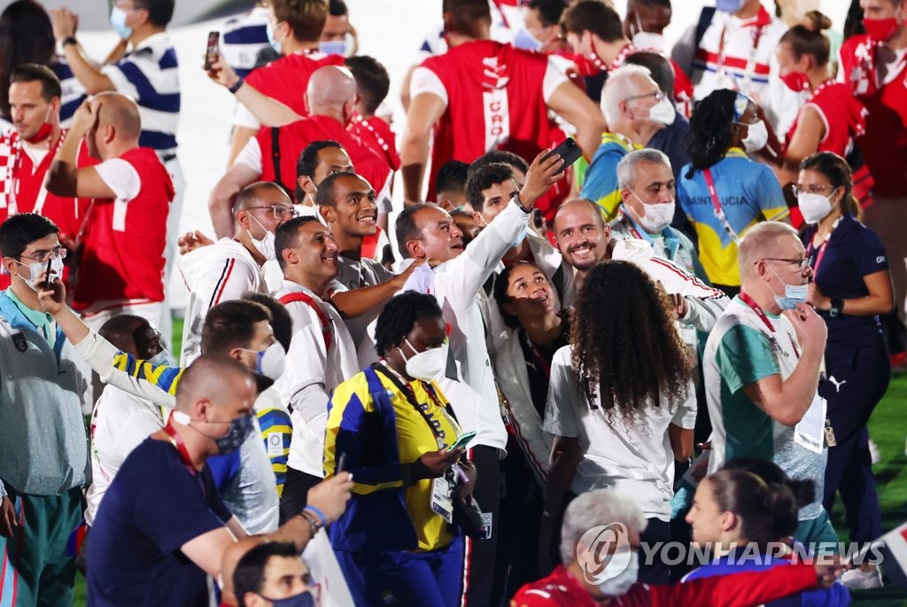 | ▲ Unmasked athletes and officials take a selfie during the closing ceremony of the Tokyo Olympics at the National Stadium in Tokyo on Aug. 8, 2021. (Yonhap) |