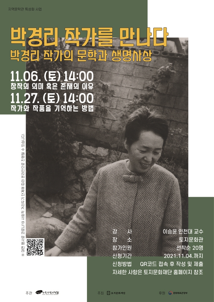 이번 강좌는 지난 8월 온라인으로 진행된 '박경리 작가의 문학과 삶'에 이은 행사다.