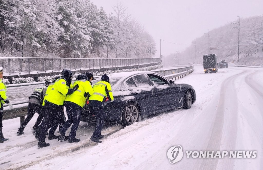 | ▲ This photo provided by the Gangwon Provincial Police Agency shows police personnel pushing a car on a snow-covered road in the county of Yangyang on Jan. 15, 2023. (PHOTO NOT FOR SALE) (Yonhap) |