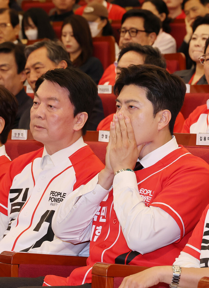 A stern-faced Kim Yong-tae (R), leader of the conservative People Power Party's emergency leadership committee, watches a TV report at the National Assembly in Seoul on June 3, 2025, about the result of exit polls that showed the party's presidential candidate, Kim Moon-soo, losing to Lee Jae-myung, the presidential candidate of the liberal Democratic Party, in the presidential election. (Yonhap)
