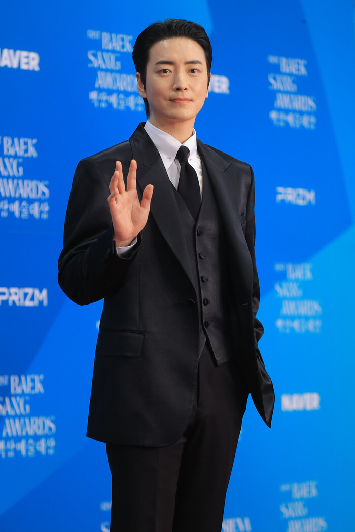 South Korean actor Lee Jun-hyuk poses for a photo on the red carpet of the 61th Baeksang Arts Awards ceremony in Seoul on May 5, 2025. (Yonhap)