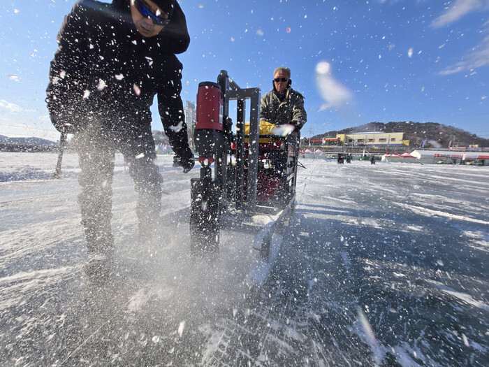 Workers drill fishing holes on a frozen stream in Hwacheon, Gangwon Province, northeastern South Korea, on Jan. 8, 2025, three days before the opening of the Hwacheon Sancheoneo Festival, which features fishing for "sancheoneo," a special kind of trout known to live only in high-quality fresh water. (Yonhap)
