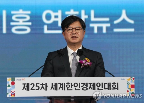 Kim offered thanks to the overseas Korean businesspeople for their hard work in promoting South Korea's economic growth with pride in their Korean heritage.