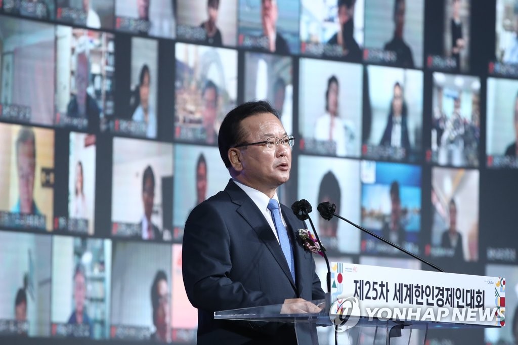 | ▲ Prime Minister Kim Boo-kyum delivers a congratulatory address at the opening of the 25th World Federation of Overseas Korean Traders Association (World-OKTA) Convention at the Grand WalkerHill Seoul on Oct. 12, 2021. (Yonhap) |