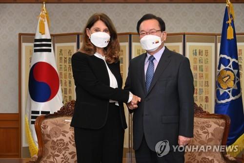 SEOUL, Nov. 10 (Yonhap) -- South Korea and Colombia agreed during foreign ministerial talks Wednesday to bolster bilateral cooperation in areas of healthcare, digital transition and climate change to overcome the fallout from the COVID-19 pandemic.