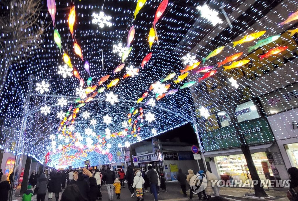 (화천=연합뉴스) 이상학 기자 = 내년 1월 7일 개막하는 '2023 얼음나라 화천산천어축제'를 앞두고 24일 오후 강원 화천군 화천읍 선등거리에서 불을 밝히는 점등 행사가 열렸다.
