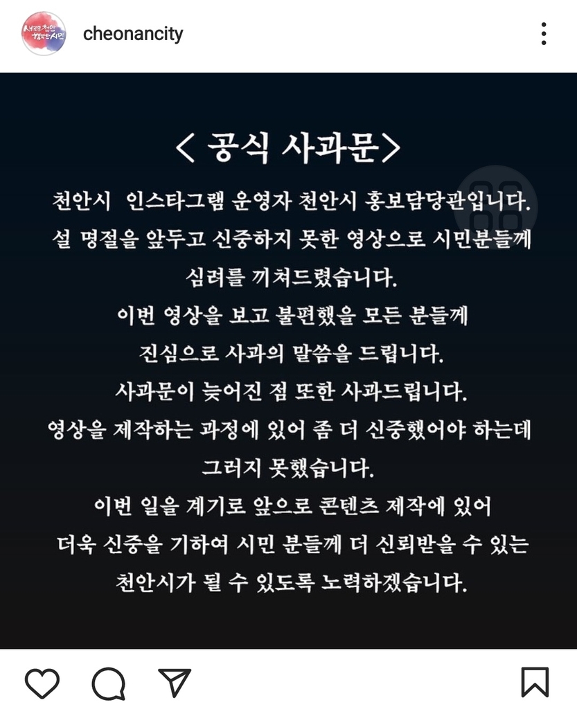 논란이 되자 천안시는 이 영상을 삭제하고 인스타그램에 사과문을 올렸다.