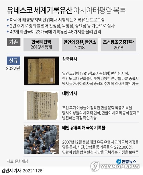 '삼국유사'·'내방가사' 등 3건, 세계기록유산 아태 목록 등재