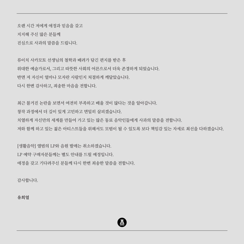그러면서 "'생활음악' 앨범의 LP와 음원 발매는 취소하겠다"며 "LP 예약 구매자들께 별도 안내를 드릴 예정이다. 애정을 갖고 기다려주신 분들께 다시 한번 죄송한 말씀을 전한다"고 했다.