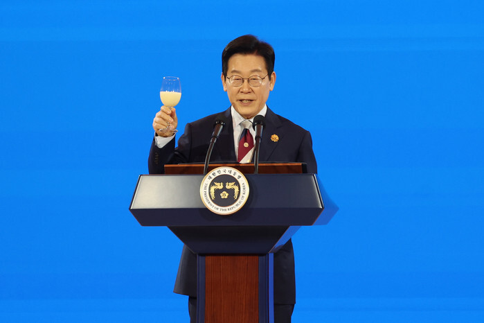 South Korean President Lee Jae Myung offers a toast during the gala dinner of the 2025 Asia-Pacific Economic Cooperation summit at the Lahan Select hotel in the southeastern city of Gyeongju on Oct. 31, 2025. (Yonhap)