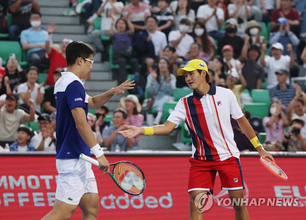 | ▲ '좋았어' (서울=연합뉴스) 신준희 기자 = 30일 오후 올림픽공원 테니스경기장에서 열린 남자프로테니스(ATP) 투어 유진투자증권 코리아오픈 복식 8강전에서 정현(왼쪽)과 권순우가 안드레 예란손(스웨덴)-벤 매클라클런(일본) 조와 경기를 펼치고 있다. 2022.9.30 hama@yna.co.kr |