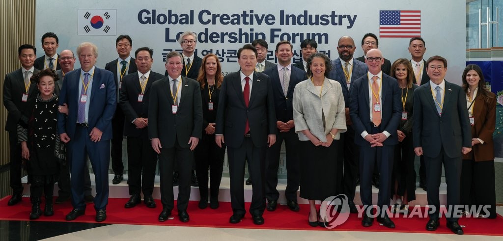 | ▲ 윤 대통령, 글로벌 영상 콘텐츠 리더들과 함께 (워싱턴=연합뉴스) 진성철 기자 = 미국을 국빈 방문한 윤석열 대통령이 27일(현지시간) 워싱턴DC 미국 영화협회에서 열린 글로벌 영상 콘텐츠 리더십 포럼에서 찰스 리브킨 미국영화협회장, 박보균 문화체육관광부 장관 등과 기념 촬영을 하고 있다. 2023.4.28 [공동취재] zjin@yna.co.kr |