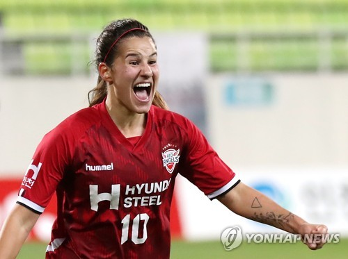 | ▲ 인천 엘리 '헤딩슛으로 골' (인천=연합뉴스) 윤태현 기자 = 16일 인천 남동경기장에서 열린 여자프로축구 챔피언결정전 2차전 인천 현대제철과 경주 한국수력원자력 축구단의 경기. 후반전 인천 엘리가 헤딩슛으로 골을 넣고 있다. 2020.11.16 tomatoyoon@yna.co.kr |