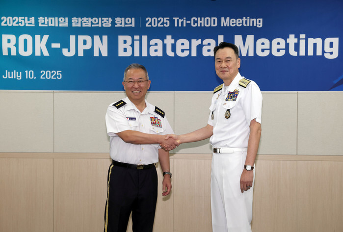 South Korean Joint Chiefs of Staff (JCS) Chairman Adm. Kim Myung-soo (R) poses for a photo with Gen. Yoshihide Yoshida, chief of the Japanese defense ministry's Joint Staff, during their meeting at the JCS' headquarters in Seoul on July 10, 2025, in this photo released by South Korea's JCS office. Yoshida has visited South Korea to meet with his South Korean and U.S. counterparts, Kim and Gen. Dan Caine. (PHOTO NOT FOR SALE) (Yonhap)