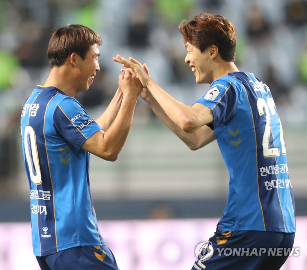 | ▲ Yoon Bitgaram (L) and Koh Myong-jin of Ulsan Hyundai FC celebrate their club's goal against Jeonbuk Hyundai Motors during their K League 1 match at Jeonju World Cup Stadium in Jeonju, 240 kilometers south of Seoul, on May 19, 2021. (Yonhap) |
