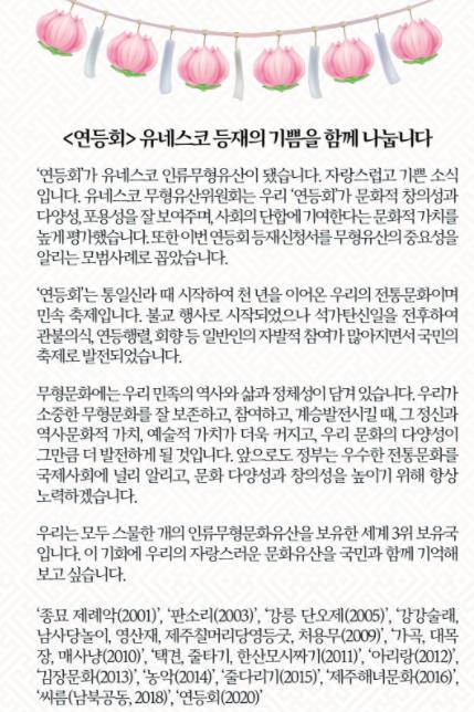 문 대통령은 이날 사회관계망서비스(SNS)를 통해 이같이 밝힌 데 이어 "앞으로 정부는 우수한 전통문화를 국제사회에 널리 알리고, 문화 다양성과 창의성을 높이기 위해 항상 노력하겠다"고 강조했다.