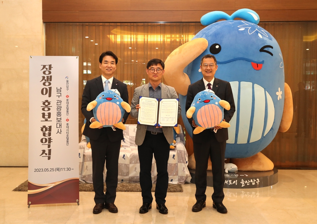 (울산=연합뉴스) 김용태 기자 = 울산시 남구는 롯데호텔울산, 롯데시티호텔울산과 관광홍보대사 '장생이' 홍보 협약식을 열었다고 25일 밝혔다.