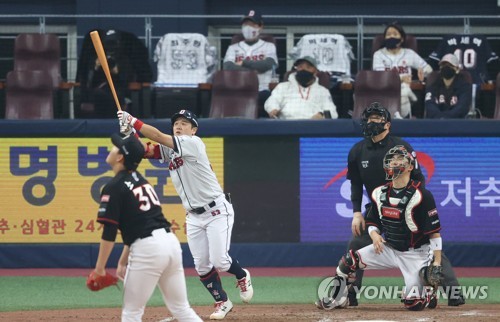 ▲ 최주환의 홈런 (서울=연합뉴스) 이진욱 기자 = 13일 오후 서울 구로구 고척스카이돔에서 열린 2020 KBO 프로야구 포스트시즌 플레이오프 4차전 kt wiz와 두산 베어스의 경기. 4회말 2사 2루 두산 최주환이 2점 홈런을 날리고 있다. 2020.11.13 cityboy@yna.co.kr
