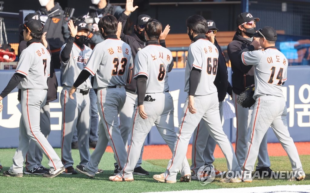| ▲ In this file photo from March 23, 2021, Hanwha Eagles players celebrate their 4-3 victory over the Doosan Bears in a Korea Baseball Organization preseason game at Jamsil Baseball Stadium in Seoul. (Yonhap) |