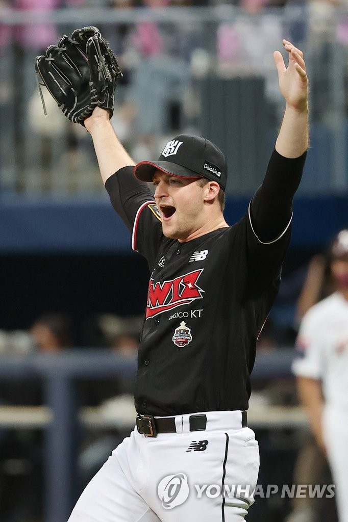 | ▲ KT Wiz starter Wes Benjamin celebrates after getting a strikeout against the Kiwoom Heroes during the bottom of the fourth inning of Game 2 of the first round in the Korea Baseball Organization postseason at Gocheok Sky Dome in Seoul on Oct. 17, 2022. (Yonhap) |