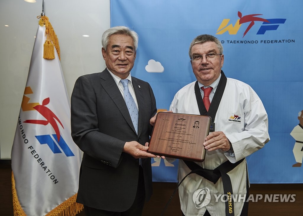 | ▲ 세계태권도연맹, 바흐 IOC 위원장에게 명예 10단증 수여 (서울=연합뉴스) 토마스 바흐 IOC 위원장이 19일 세계태권도연맹(WTF) 서울본부를 방문, 조정원 총재로부터 명예 10단증을 받은 뒤 기념촬영을 하고 있다. 2015.8.19 << WTF 제공>> photo@yna.co.kr |