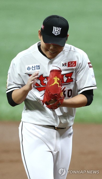 | ▲ 소형준, '이대로 가자' (서울=연합뉴스) 류영석 기자 = 9일 서울 고척 스카이돔에서 열린 2020 프로야구 포스트시즌 플레이오프 1차전 두산 베어스와 kt wiz의 경기. kt 선발 소형준이 1회초를 마친 뒤 웃고 있다. 2020.11.9 ondol@yna.co.kr |