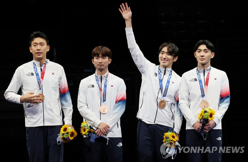 CHIBA, Japan, July 30 (Yonhap) -- With one last bout left, South Korea was tied with China at 34-34 in the bronze medal match of the men's epee fencing team event Friday at the Tokyo Olympics.