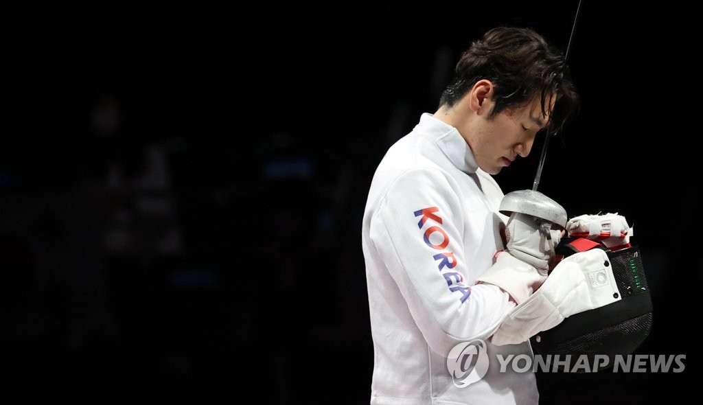 | ▲ Park Sang-young has a moment with himself before taking on Dong Chao of China in the bronze medal match of the men's epee fencing team event at the Tokyo Olympics at Makuhari Messe Hall B in Chiba, Japan, on July 30, 2021. (Yonhap) |