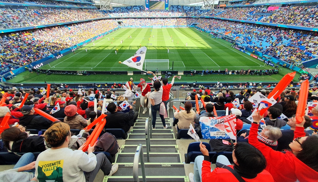 | ▲ 2023 FIFA 호주·뉴질랜드 여자월드컵 한국·콜롬비아 경기 (시드니=연합뉴스) 정동철 통신원 = 2023 FIFA 호주·뉴질랜드 여자월드컵 한국·콜롬비아 경기에서 한국 관중들이 열렬하게 응원하고 있다. 2023.7.25. dcj@yna.co.kr |