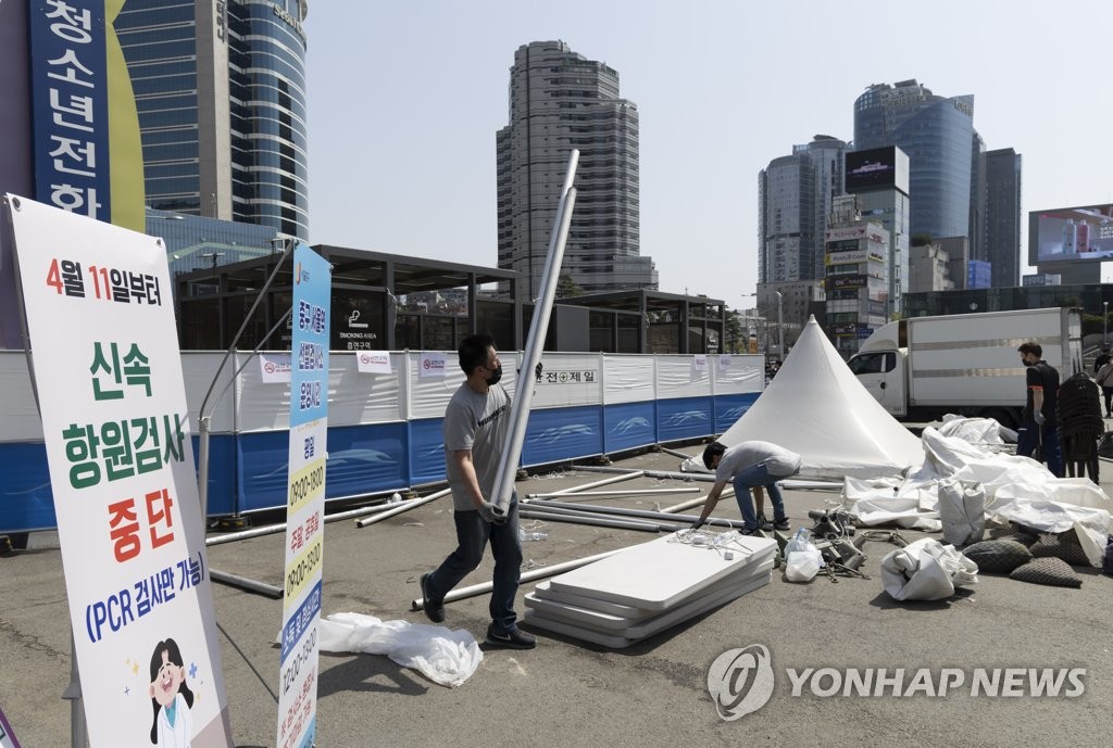 | ▲ Some COVID-19 testing tents at Seoul Station are being disassembled on April 10, 2022, as all makeshift COVID-19 testing booths will stop carrying out free rapid antigen tests and only provide polymerase chain reaction tests for potential patients in high-risk groups starting April 11. (Yonhap) |