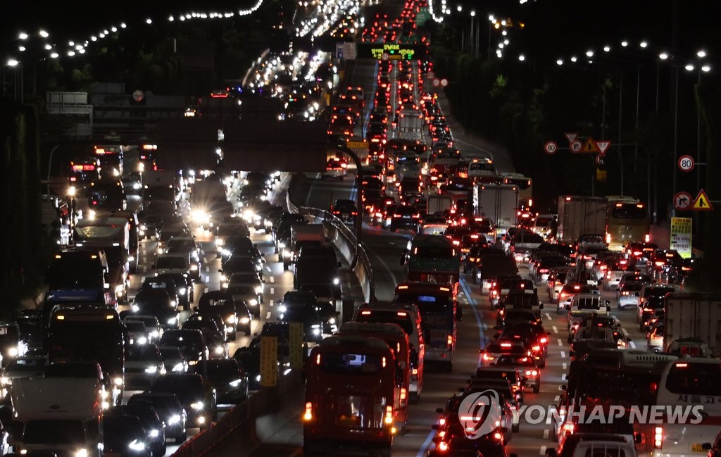 이날 오후 10시 승용차로 전국 주요 도시에서 출발해 서울 요금소까지 도착하는 시간은 부산 5시간, 목포 4시간 50분, 울산 4시간 40분, 광주 4시간 20분, 대구 4시간, 대전 3시간, 강릉 2시간 40분 등이다.