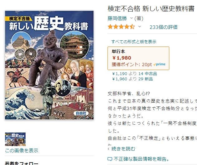 | ▲ 검정 탈락 우익 교과서 (도쿄=연합뉴스) 검정에 탈락한 지유샤(自由社)의 중학교 역사 교과서가 21일 아마존 저팬에서 판매되고 있다. [아마존 저팬 화면 캡처, 재판매 및 DB 금지] |