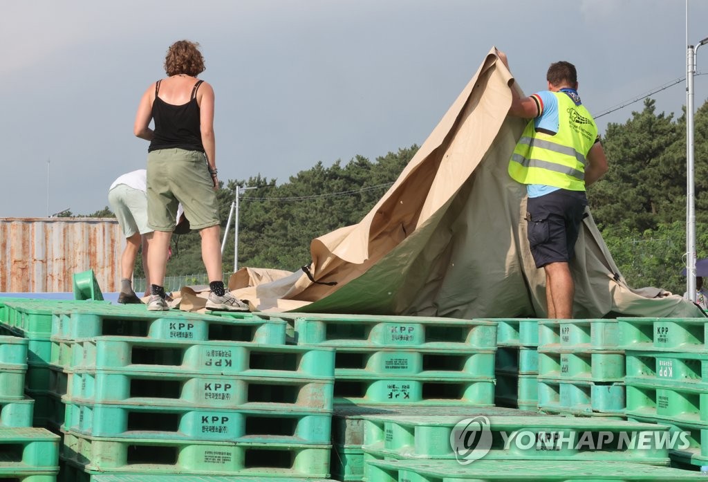 | ▲ 독일 잼버리 부스 정리 (부안=연합뉴스) 나보배 기자 = 독일 스카우트 대원들이 7일 전북 부안군 잼버리장 델타구역 내 부스를 정리하고 있다. 2023.8.7 warm@yna.co.kr |
