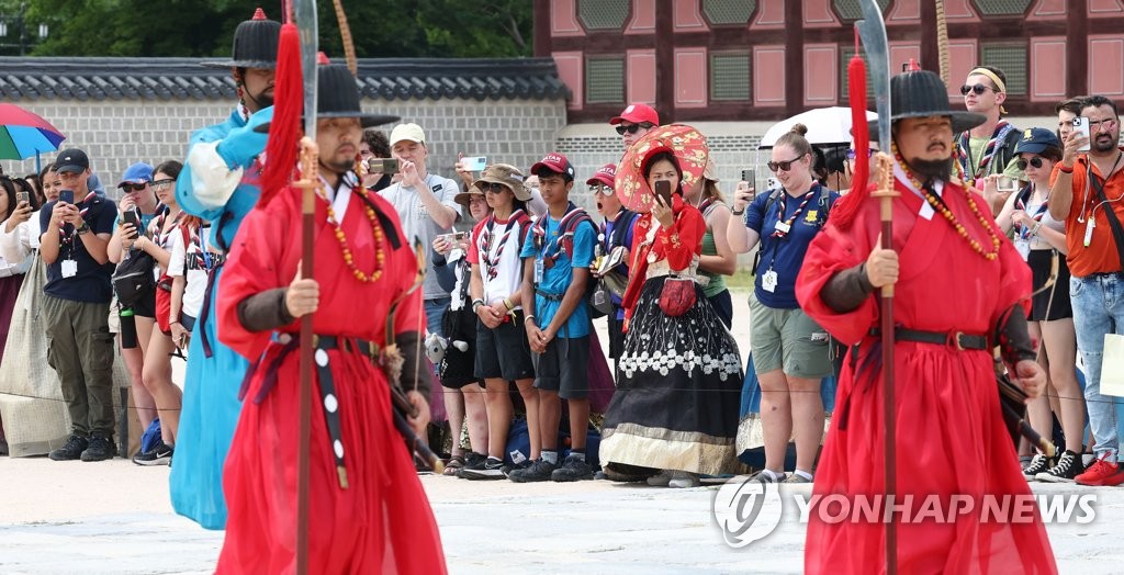 | ▲ 수문장 교대의식 지켜보는 영국 스카우트 대원들 (서울=연합뉴스) 김인철 기자 = 2023 새만금 세계 스카우트 잼버리에서 조기 퇴영한 영국 스카우트 대원들이 7일 오후 서울 종로구 경복궁을 방문해 수문장 교대의식을 관람하고 있다. 2023.8.7 yatoya@yna.co.kr |