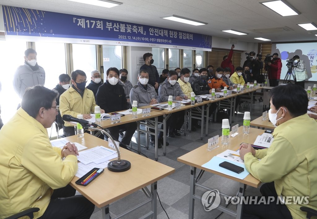 | ▲ 부산불꽃축제 안전대책 현장 점검회의 (부산=연합뉴스) 강덕철 기자 = 박형준 부산시장이 14일 오전 광안리해수욕장 앞 수영구 생활문화센터에 설치된 부산불꽃축제 종합상황실에서 열린 안전대책 점검회의에서 발언하고 있다. 2022.12.14 kangdcc@yna.co.kr |