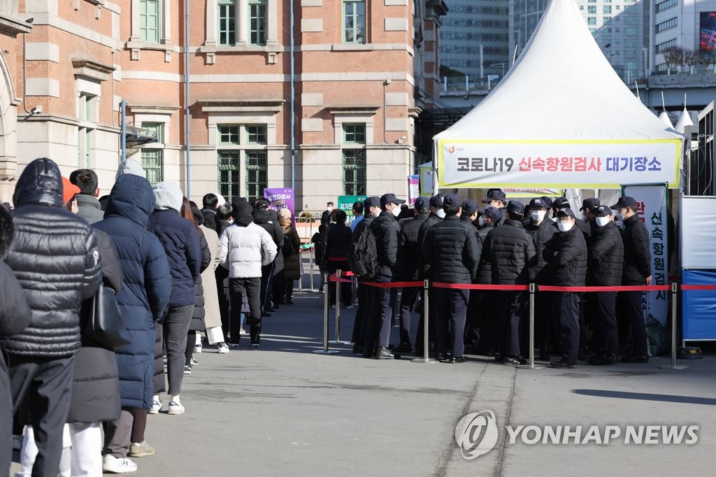 | ▲ This photo taken on March 6, 2022, shows people lined up to take coronavirus tests at a makeshift testing center in front of Seoul Station in central Seoul. (Yonhap) |