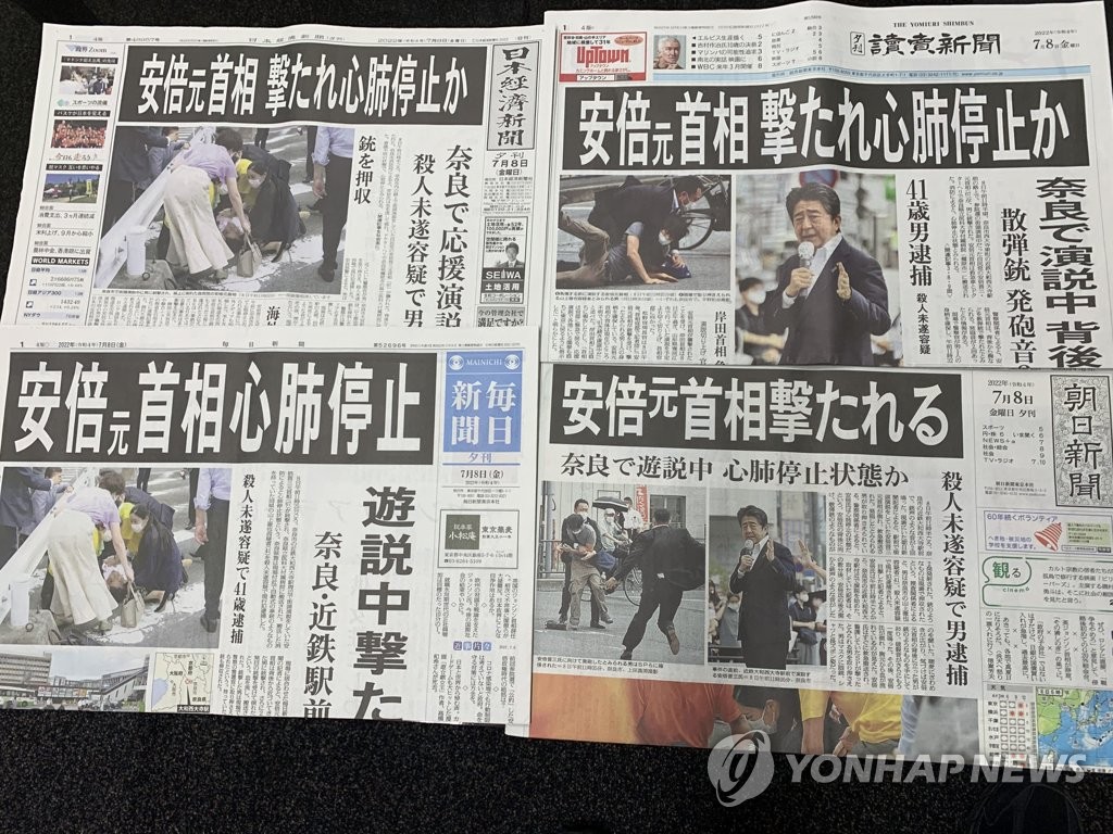 | ▲ 아베 전 총리의 총격 사건 보도한 일본 석간신문들 (도쿄=연합뉴스) 박성진 특파원 = 일본 석간신문들이 8일 선거 지원 유세 중 총격을 받아 심폐 정지 상태가 된 아베 신조 전 총리 사건을 신문 1면 톱 기사로 보도하고 있다. 아베 전 총리는 결국 사망했다. |